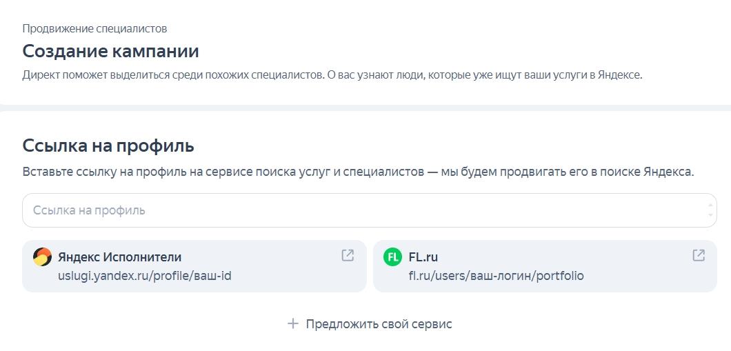 В Директе можно продвигать аккаунты специалистов на сервисах Яндекс Услуги и FL.ru. Для этого нужно указать ссылку на профиль, затем настроить параметры кампании.