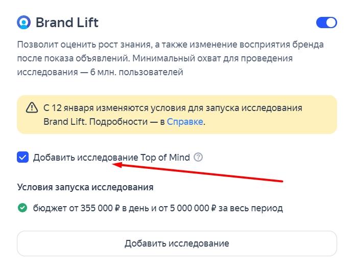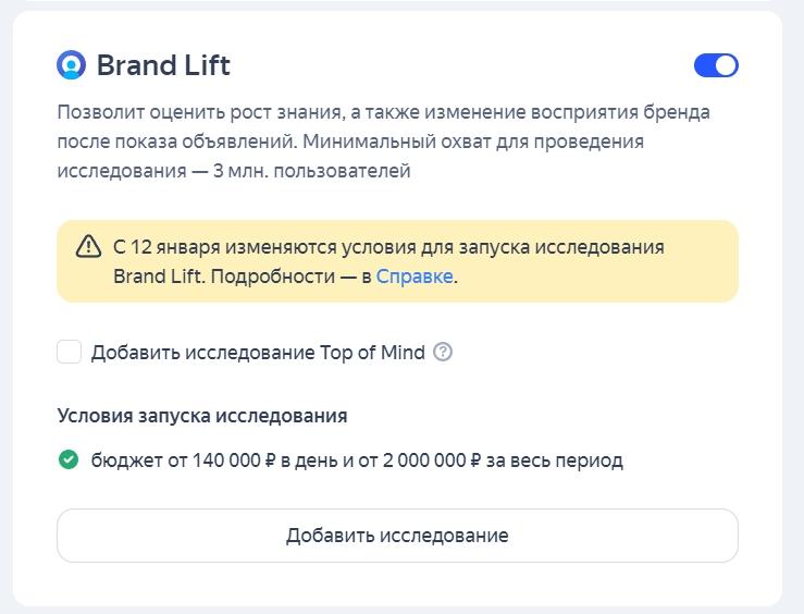 Дополнительно к Brand Lift можно добавить исследование Top of Mind. Оно доступно для новых медийных кампаний с баннерами и видео. Включает вопрос о знании бренда без подсказок: респондента просят назвать бренд самостоятельно. Для запуска требуется бюджет от 355 000 ₽ в день и от 5 000 000 ₽ за весь период, минимальный охват — от 6 млн человек.