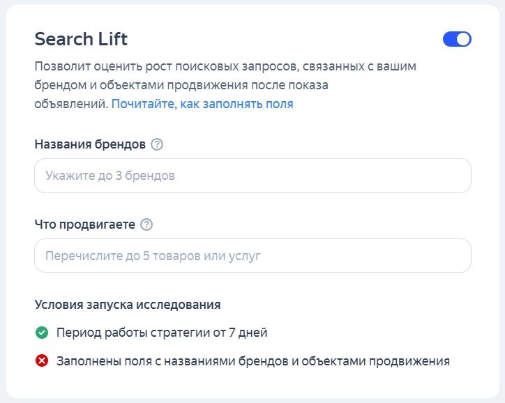 Для запуска Search Lift нужно указать до 3 брендов и до 5 рекламируемых товаров или услуг. Минимальная длительность исследования — 21 день, рекомендуемый бюджет — от 300 000 рублей, охват — от 1 млн пользователей, показов от 5 000 000.