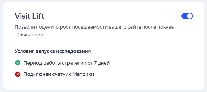 Для запуска исследования нужно подключить счетчик Метрики. Минимальный период работы стратегии — 7 дней. Чтобы результаты были корректными, Директ рекомендует запускать Visit Lift при бюджете от 100 000 рублей, продолжительностью от 2 недель и охватом от 200 000 пользователей.
