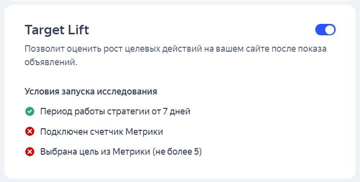 Для запуска Target Lift необходимо подключить счётчик Метрики и указать до пяти целей.