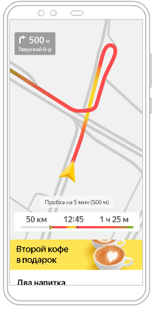 - Баннеры при построении маршрута в Навигаторе — тот же формат, но отображется в процессе построения маршрута в приложении.