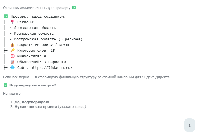 В режиме диалога с AI-ассистентом вы поэтапно настроите географию показа, целевую аудиторию, подберете ключевые и минус-слова, на основе которых ИИ создаст креативы, определите бюджет кампании. После финальной проверки и подтверждения AI создаст кампанию и загрузит ее в прямой аккаунт «Яндекс Директа».