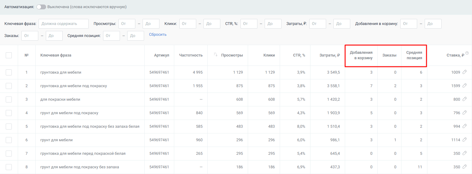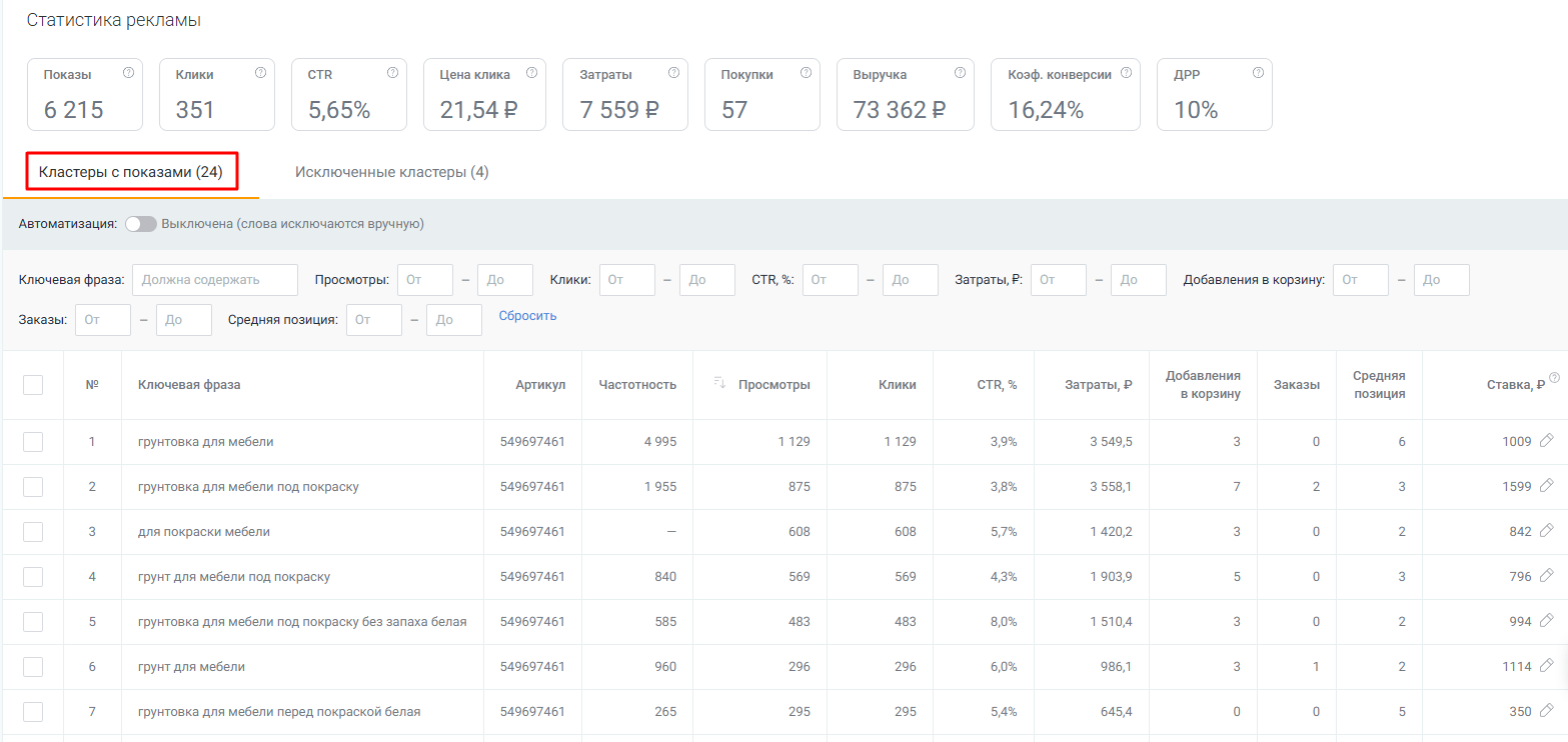 Для рекламных кампаний Wildberries с оплатой за CPM мы добавили новые метрики в таблицу статистики по кластерам запросов: добавления в корзину, заказы, средняя позиция. Теперь можно отфильтровать кластеры, по которым карточка товара занимает высокие позиции, приносит больше заказов или товар чаще добавляют в корзину.