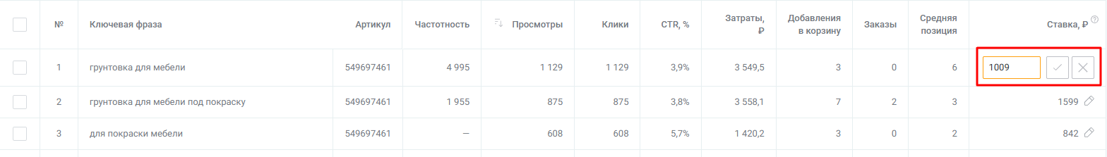 В таблице появился новый столбец — «Ставка, ₽». В нем напротив каждого кластера, кликнув на иконку карандаша, вы можете ввести сумму и сохранить изменения.