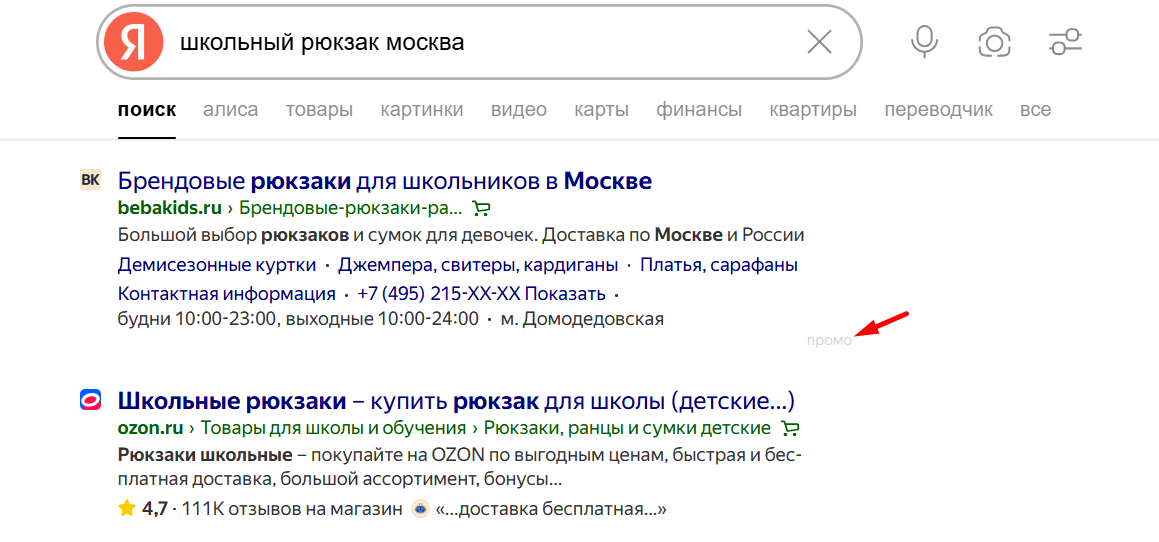 В поиске Яндекса объявления обозначены пометкой «промо»