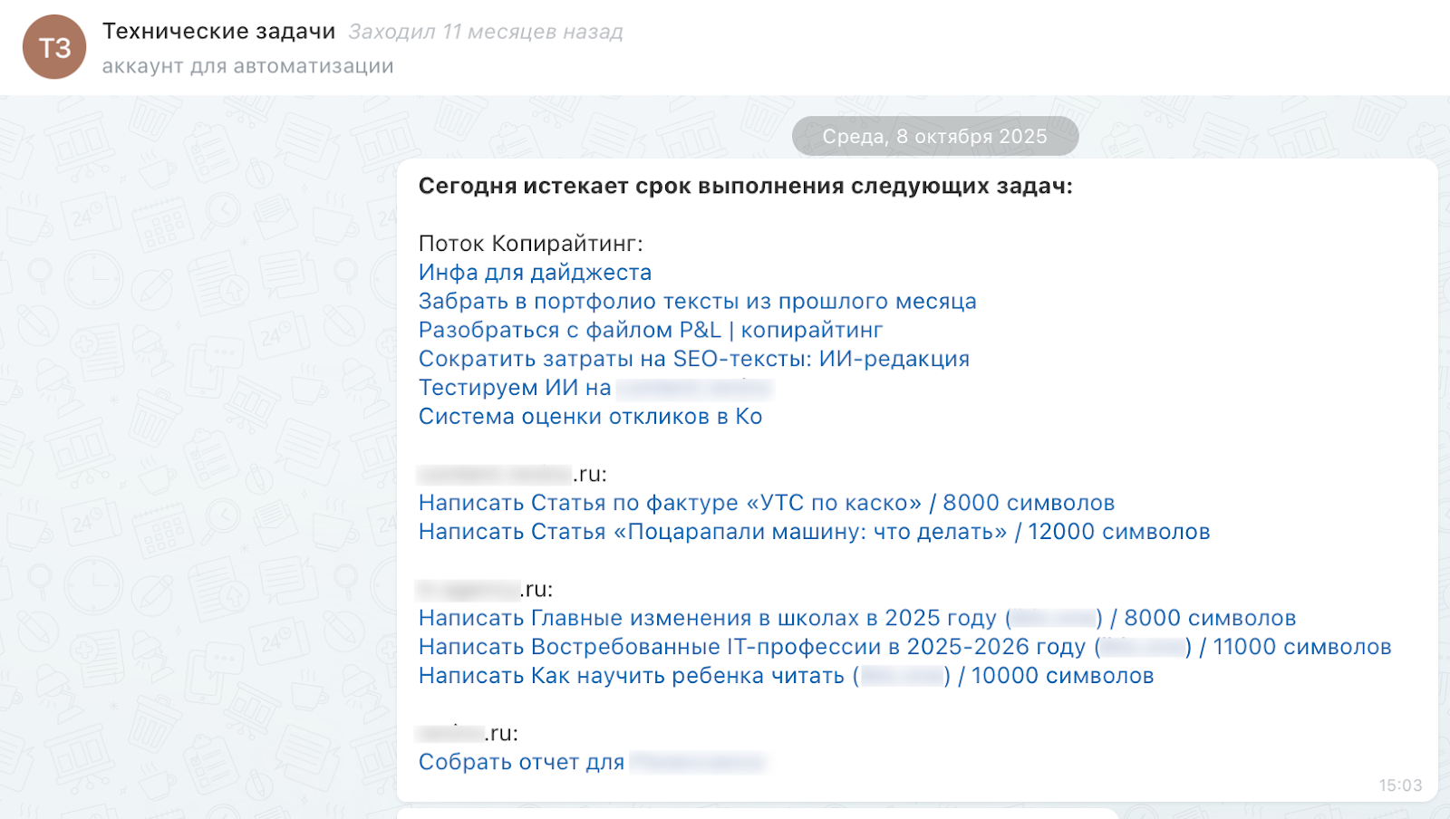 - Автоматизация внутренних процессов. Например, когда чат-бот напоминает о дедлайнах, собирает статусы по задачам, автоматически передает информацию между рабочими сервисами.