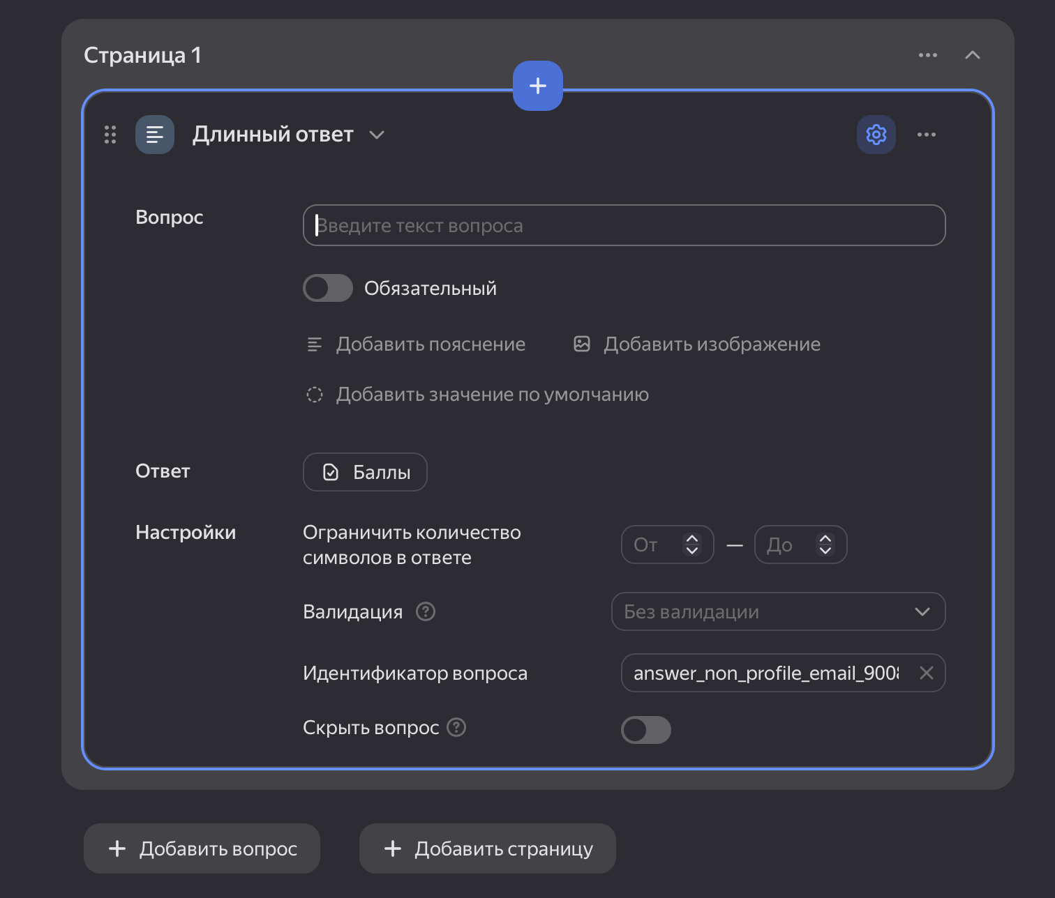 Любой вопрос можно сделать обязательным, добавить к нему пояснение и обложку, назначить балл за заполнение, в случае вопросов с выбором — указать верный ответ (если собираете тест).