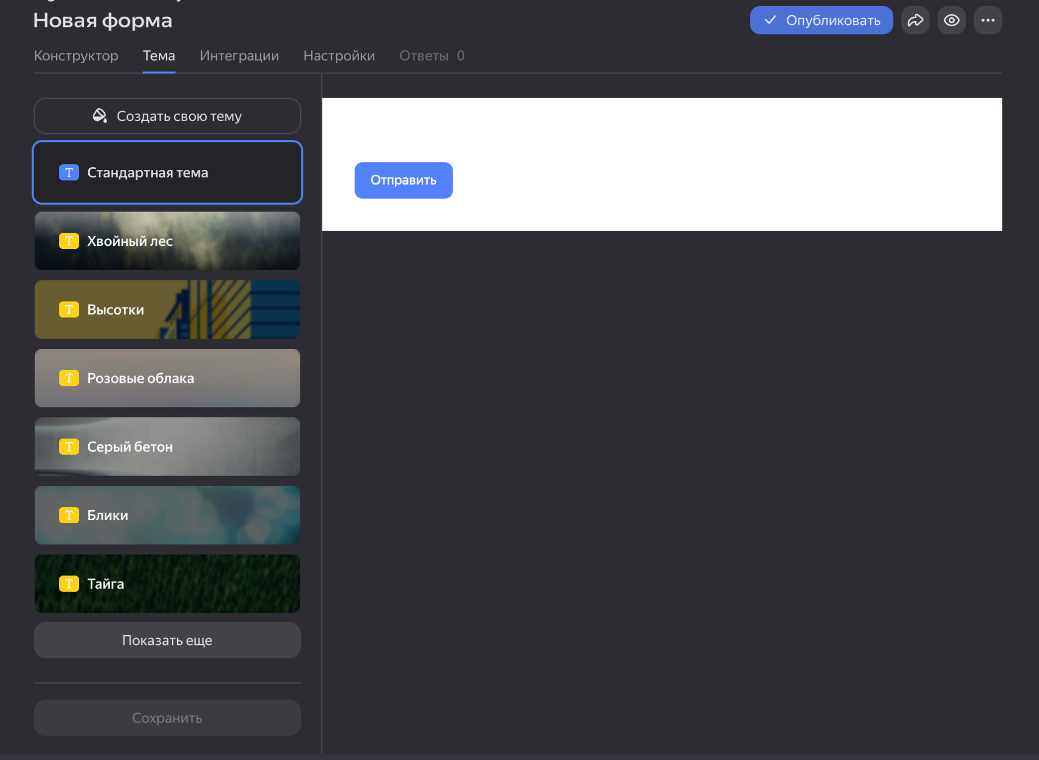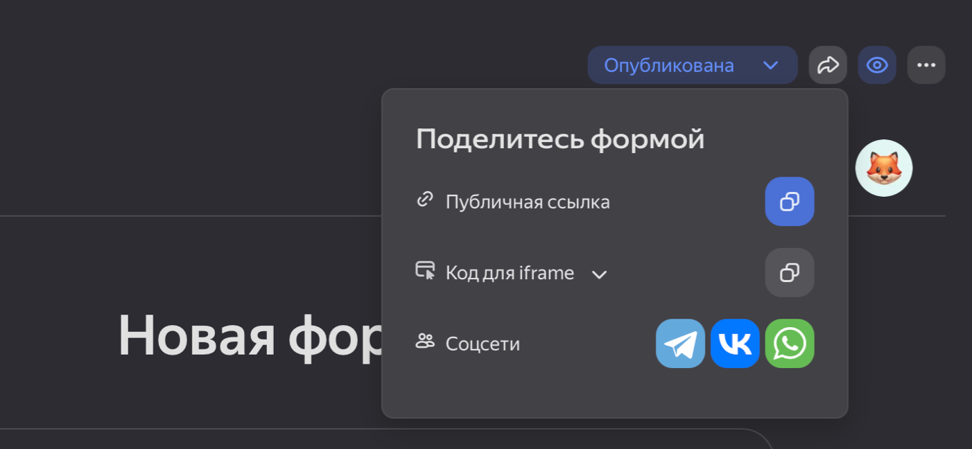 Опубликованная форма по умолчанию появится на сайте Яндекс Форм. Ею можно сразу поделиться: