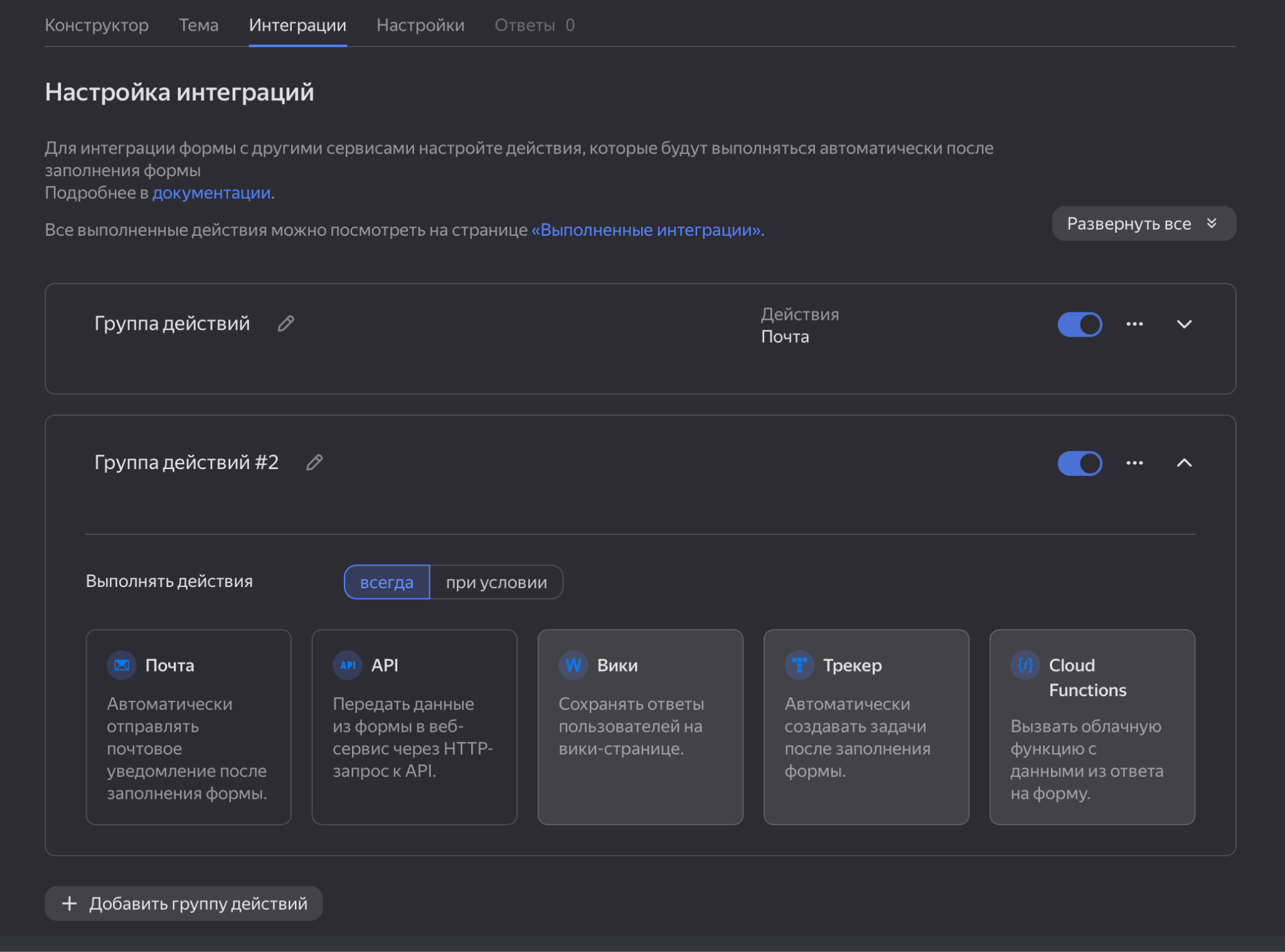 Есть формы «личные» и «для бизнеса». Вторые можно встраивать в бизнес-процессы: ограничить доступ людям вне организации или команды, сгруппировать по отделу или проекту, связать с другими сервисами экосистемы (с подпиской Яндекс 360).