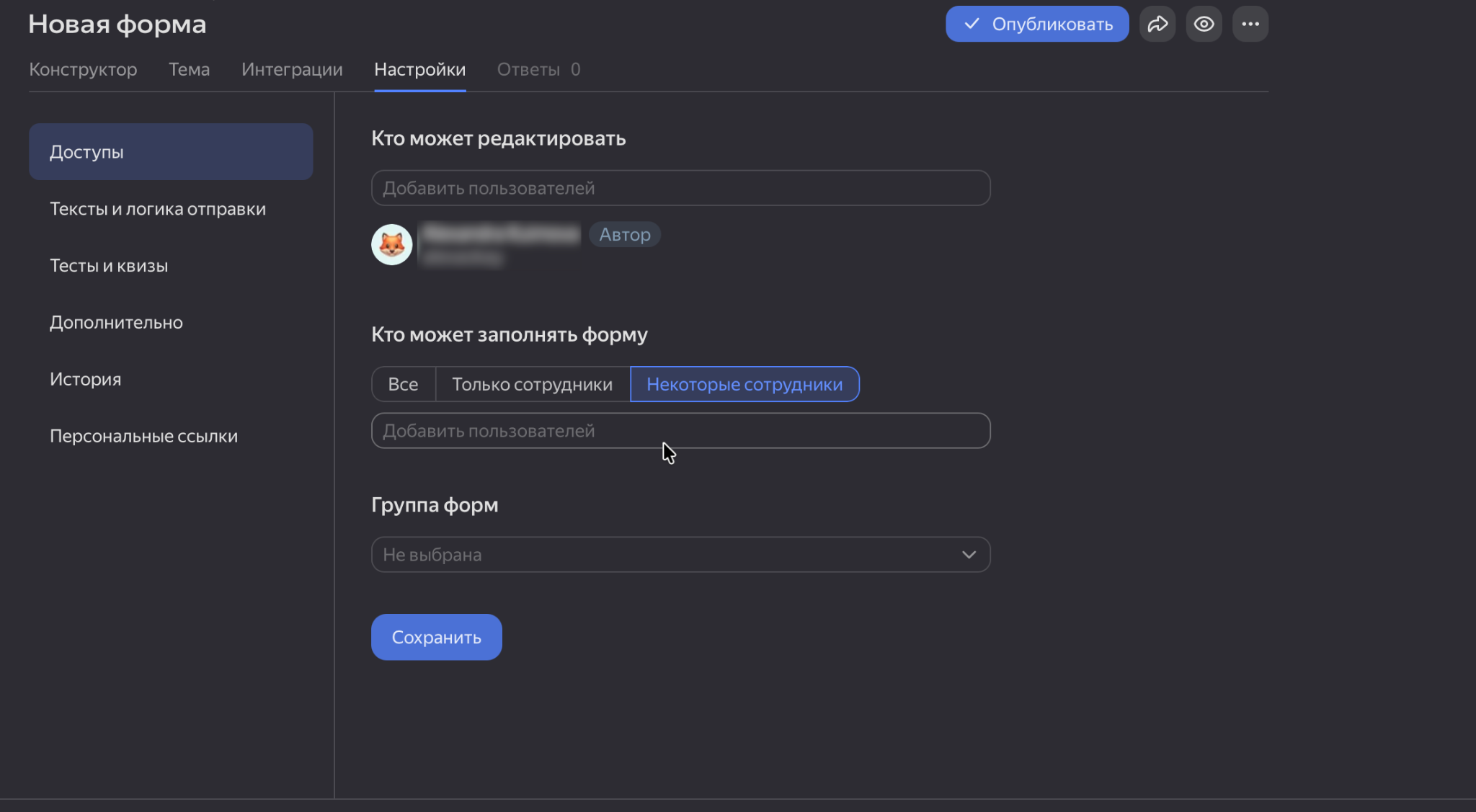 Влияет на то, кто сможет увидеть и заполнить форму: