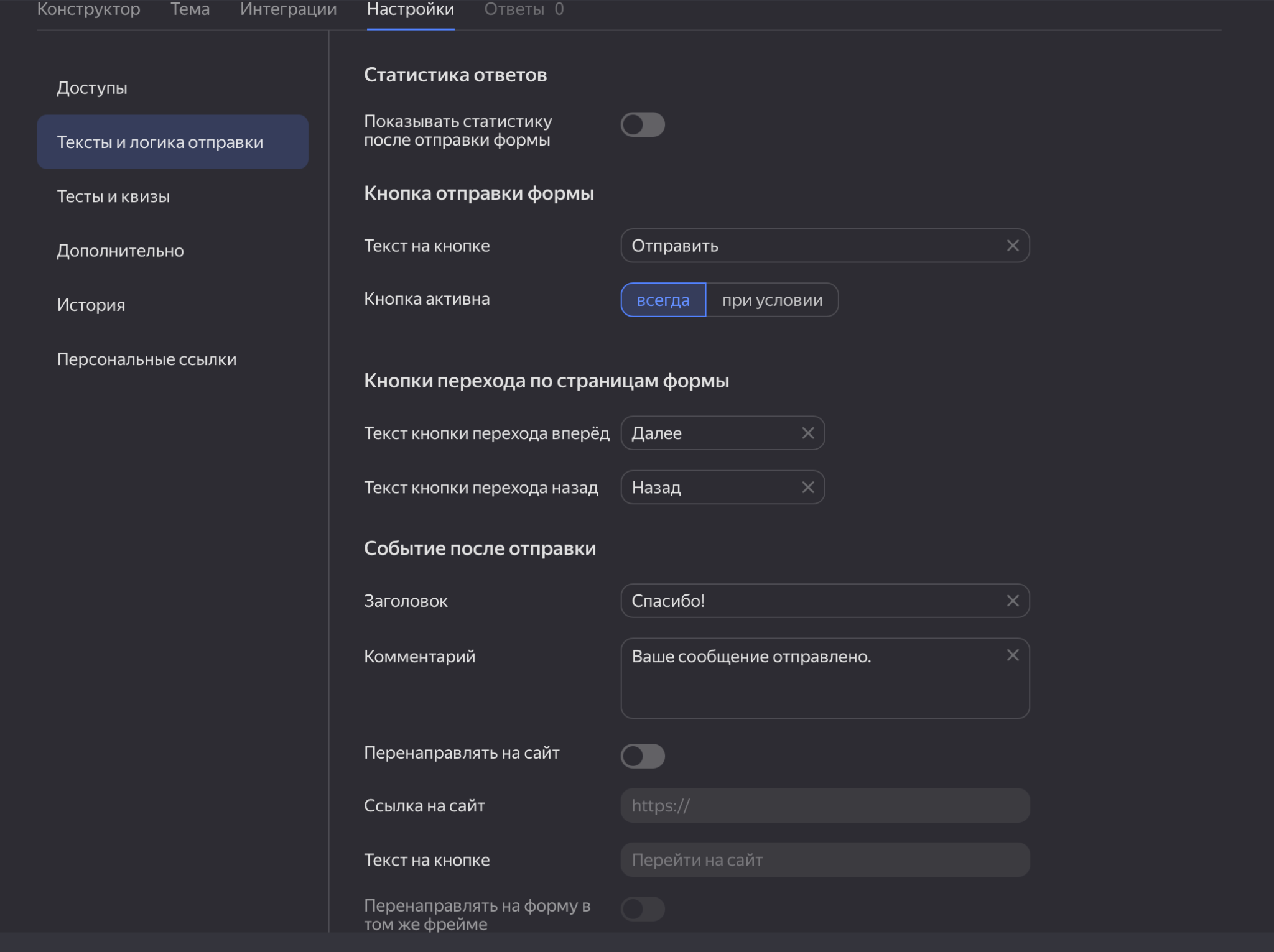 - Настраиваем так называемую «презентацию» — текст кнопок, сообщение после отправки, дополнительные действия и условия: