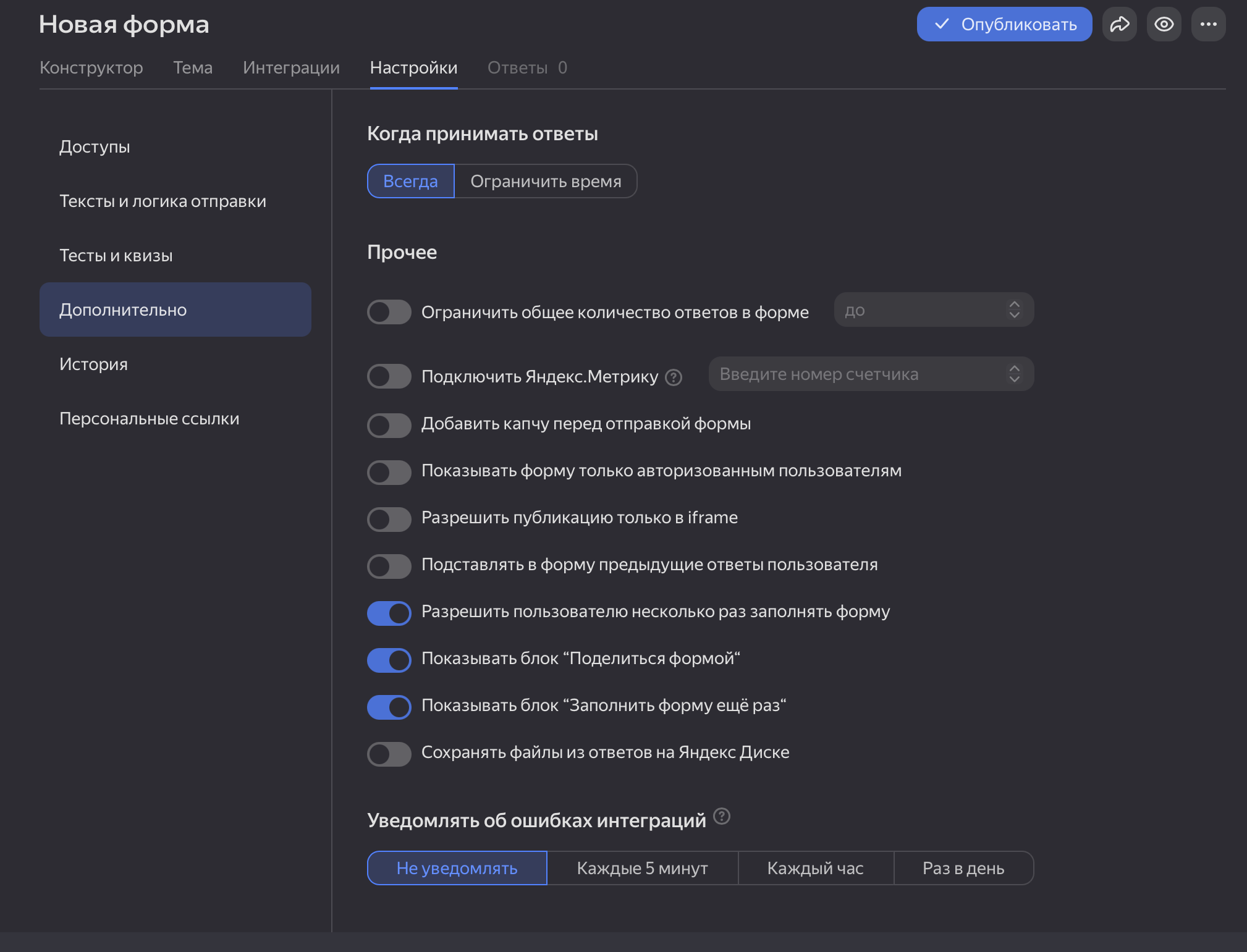 Да. В настройках можно ограничить прием ответов по времени или по общему количеству. Это удобно, например, для регистрации на мероприятие с ограниченным числом мест или в опросах с фиксированным сроком.
