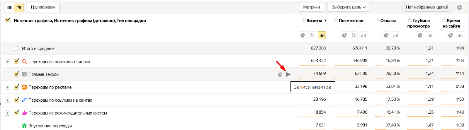 Перейти в отчет «Источники» → «Источники, сводка». Найти в таблице строку с данными по прямым заходам, навести курсор и кликнуть на значок «Записи визитов».