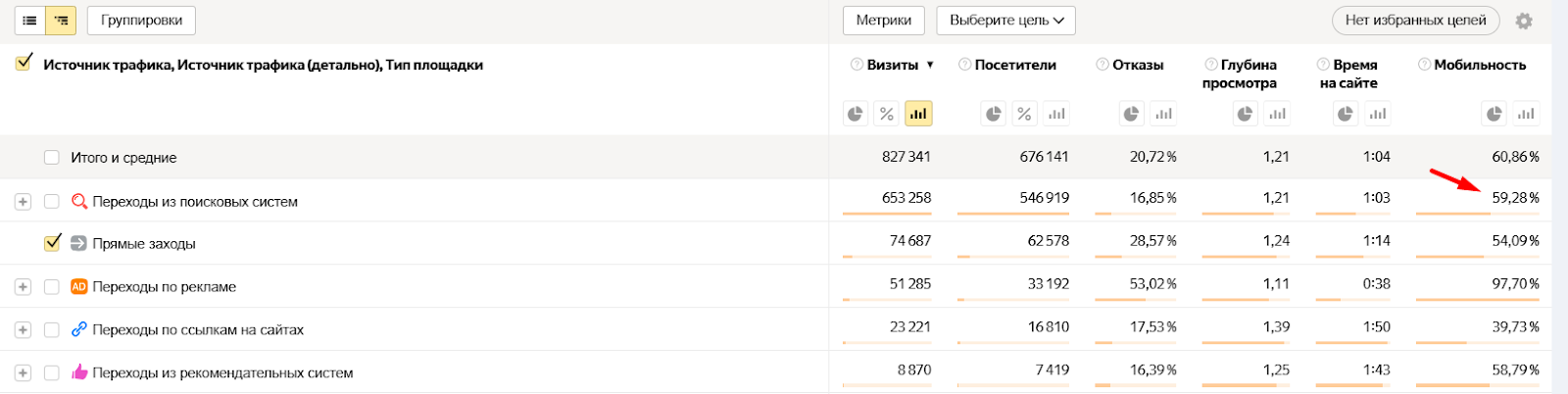 Чтобы проанализировать, сколько совершено прямых заходов с мобильных устройств, нужно в отчете «Источники» → «Источники, сводка» добавить колонку с метрикой «Мобильность», она показывает долю визитов с мобильных устройств.