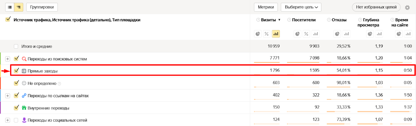 В таблице найдите строку «Прямые заходы». Для этой группы, как и для всех остальных, можно настроить отображаемые метрики: визиты, посетители, отказы, глубину просмотра и прочие.