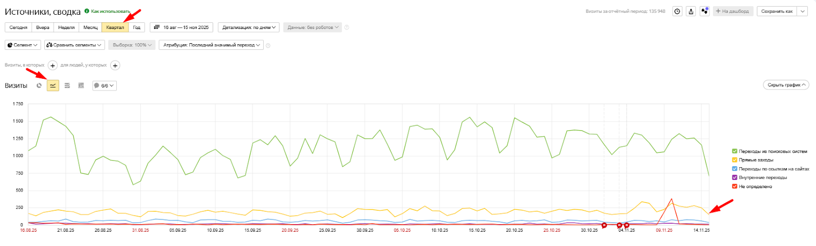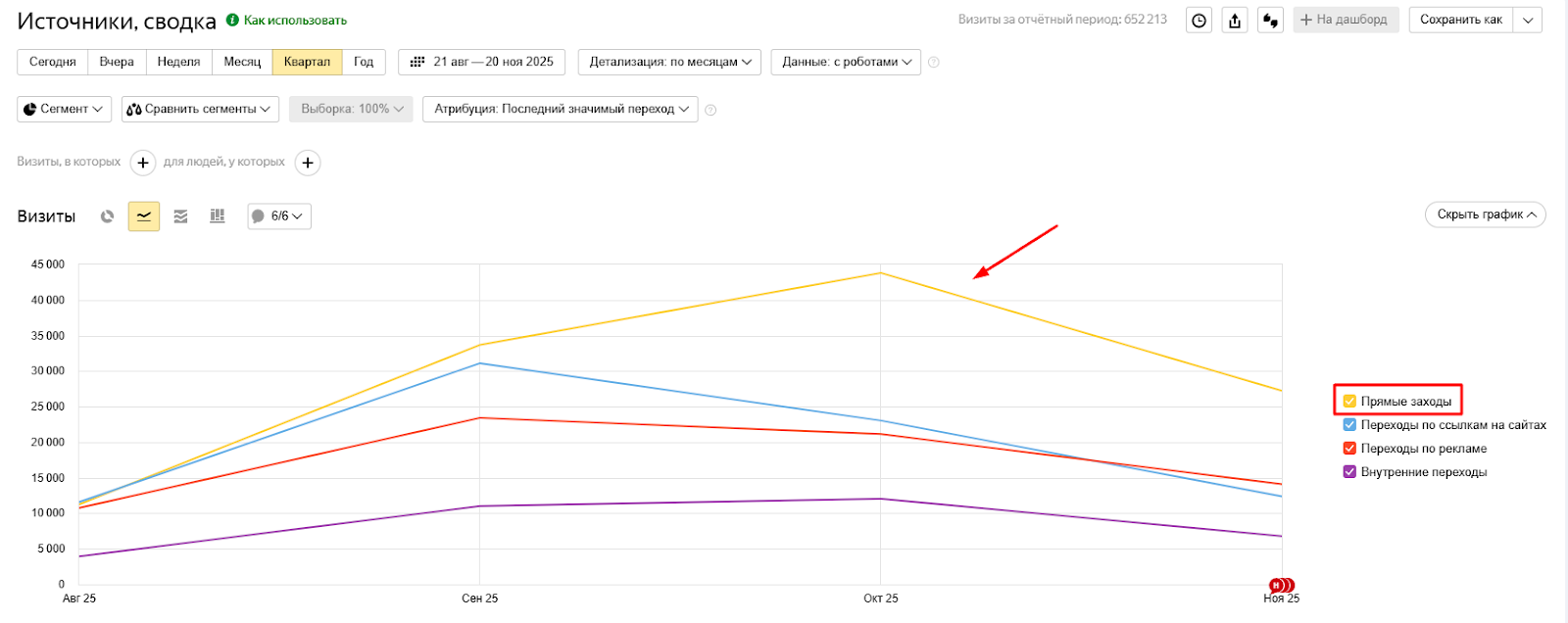 Например, построим линейный график за квартал. Из него видно, что есть небольшой, но не слишком значительный рост прямых заходов на сайт, поэтому можно исключить некорректный сбор данных Метрикой, ошибки в UTM-метках и прочее.