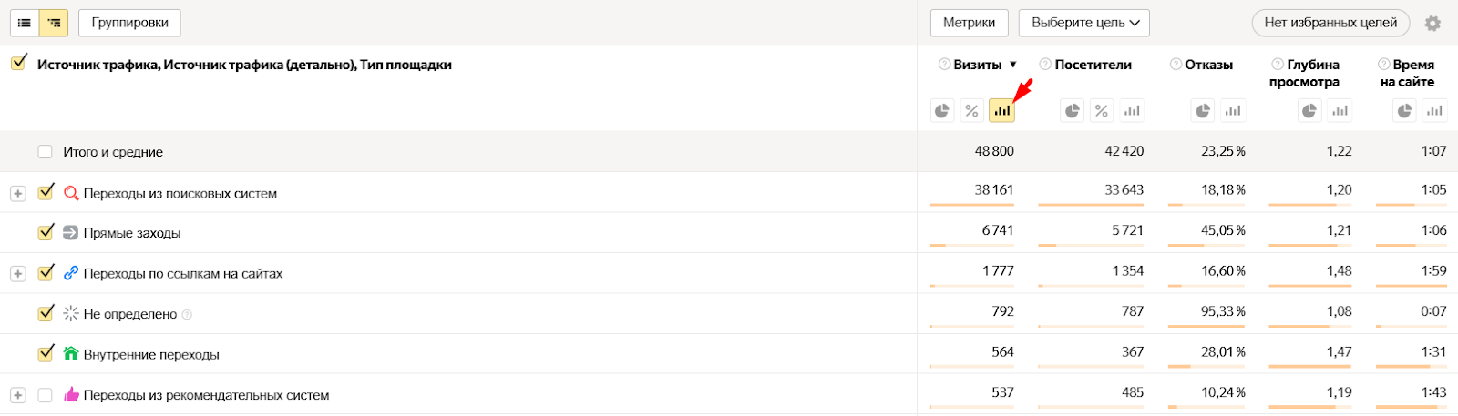 Изначально данные таблицы указывают фактический трафик за заданный период (в столбце «Визиты» выбрана иконка с колонками). В примере ниже период анализа составляет месяц.