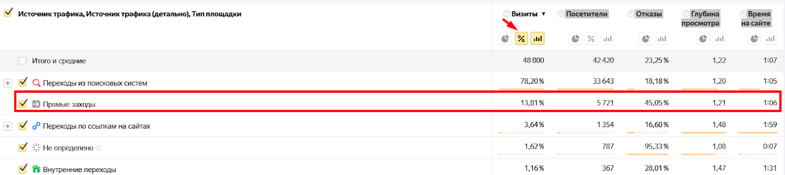 Для просмотра доли прямых заходов нужно в колонке «Визиты» кликнуть на иконку с процентами. Таким образом, из отчета видно, что их доля в месячном трафике сайта составила 13,81%.
