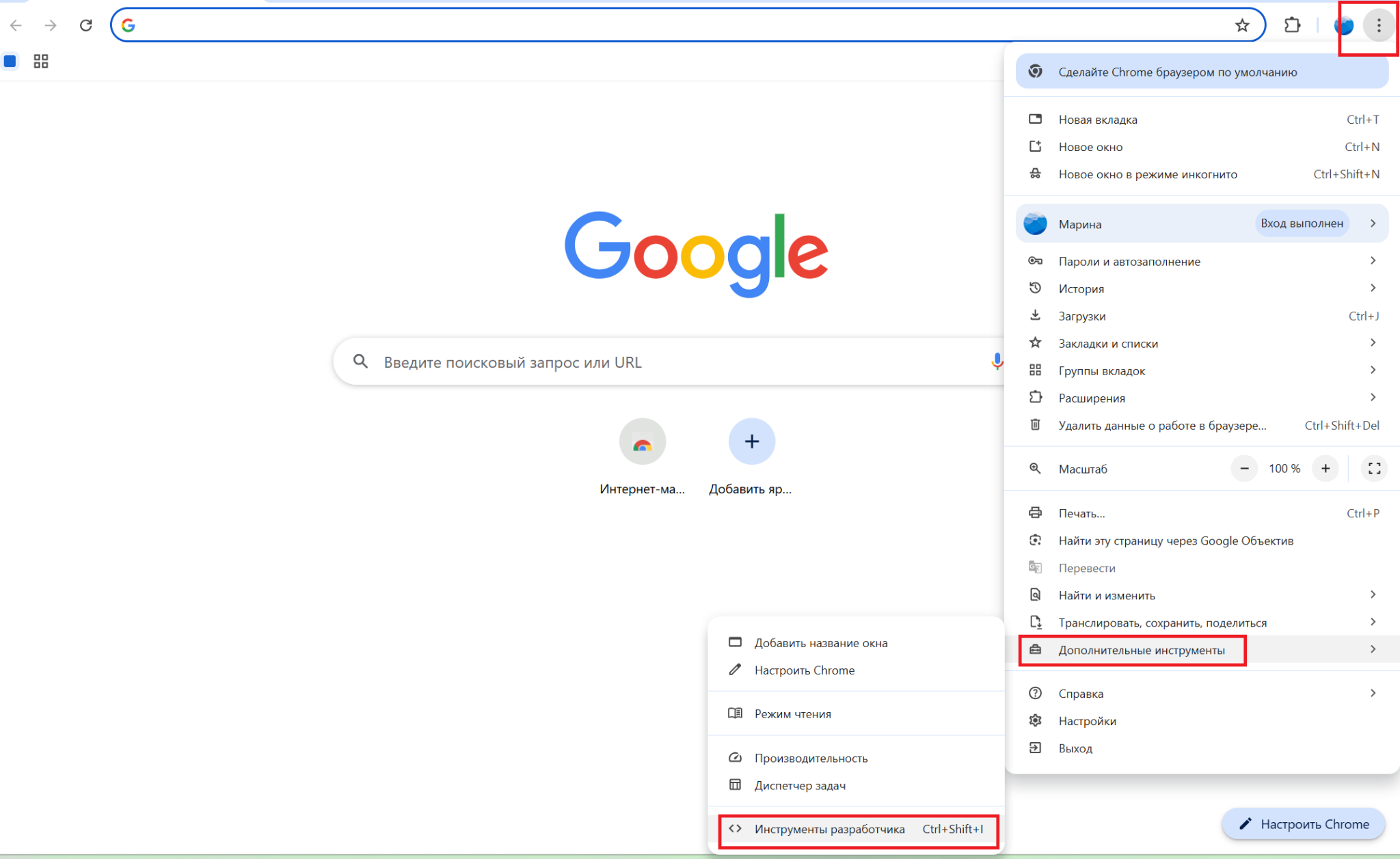 Заходим в настройки браузера (три точки вверху экрана), выбираем «Дополнительные инструменты» → «Инструменты разработчика».