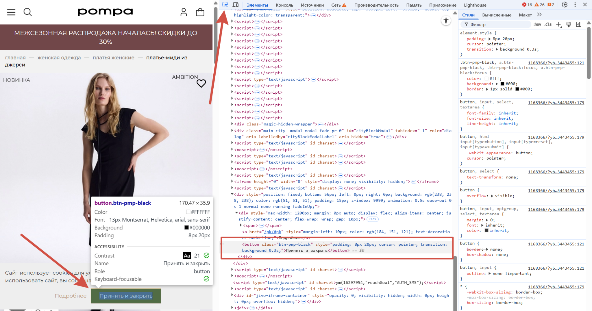 В левом верхнем углу есть значок стрелки. Если нажать на него, а затем навести курсор на какой-нибудь элемент сайта, то код этого элемента подсветится в консоли. Его можно редактировать: менять HTML-структуру, теги, атрибуты, текст, CSS-стили. Например, можно, поменять размер и цвет кнопки, чтобы визуально оценить другое оформление.