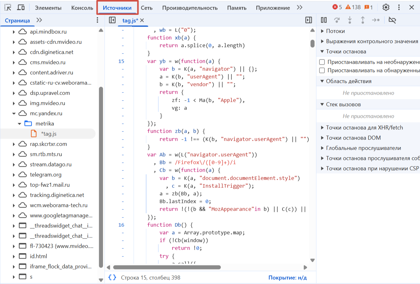 Это основная панель для отладки, где разработчики устанавливают точки останова (breakpoints), чтобы анализировать выполнение кода пошагово и находить ошибки.