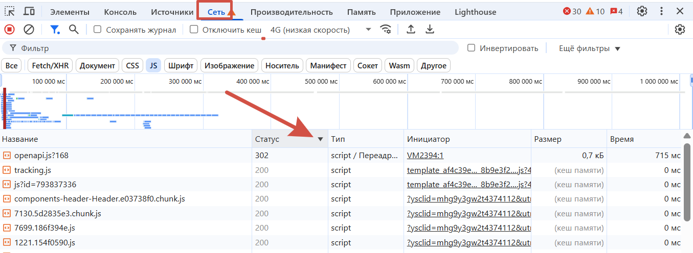 Чтобы быстро найти проблемные коды ответа, используйте сортировку по статусу. Для этого кликните на черный треугольник в колонке «Статус», чтобы он смотрел острием вниз. Запросы отсортируются от большего к меньшему, и все ошибки 5xx и 4xx окажутся в самом верху списка.