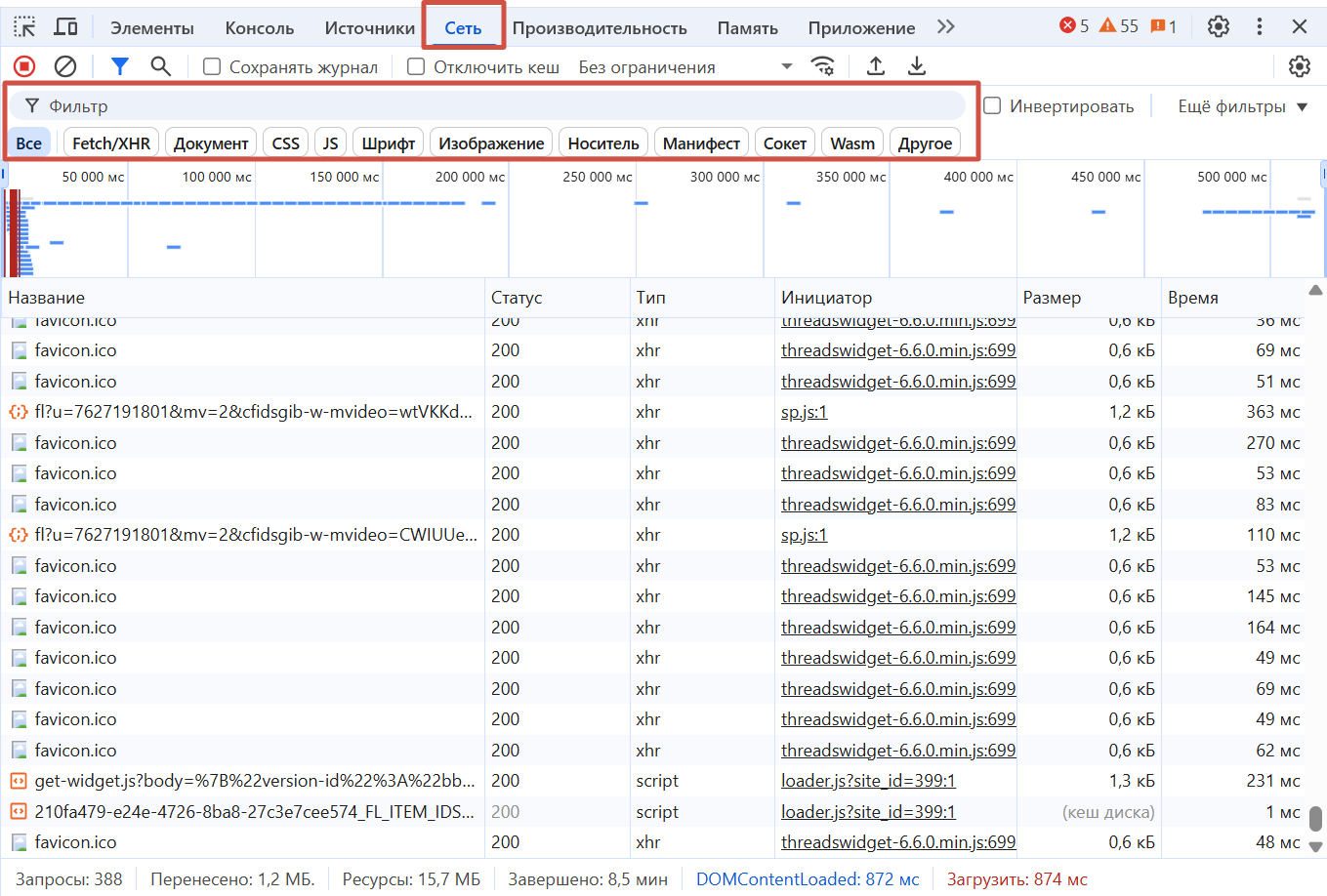 Можно смотреть размер и время загрузки каждого элемента. Визуальная шкала наглядно показывает, какие ресурсы грузятся долго, а какие — мгновенно, и как это влияет на общее время открытия страницы. Если документ грузится медленно, вы сразу увидите, какой именно файл «тормозит» весь процесс.