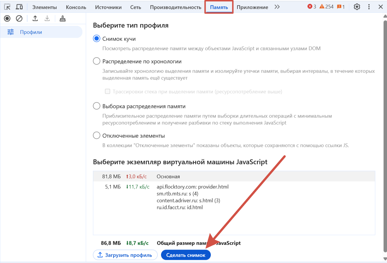 Здесь можно отслеживать объем памяти и анализировать потребление ресурсов. Инструмент позволяет делать снимки памяти и находить утечки — ситуации, когда ресурсы не освобождаются и накапливаются, что приводит к разным сбоям и замедлению производительности.