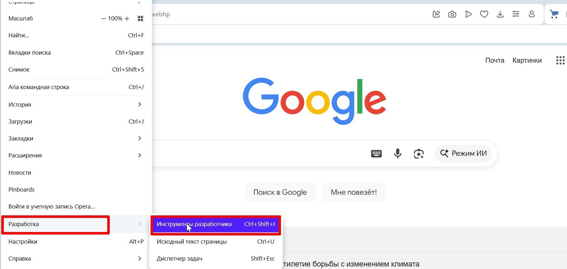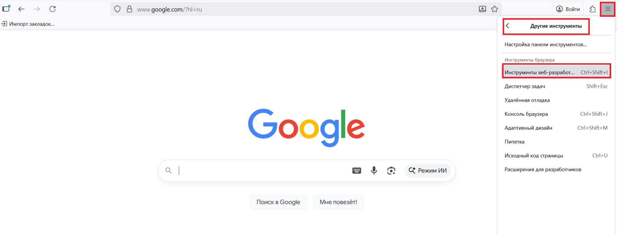 Можно открыть инструменты разработчика через меню браузера — это самый надежный способ.