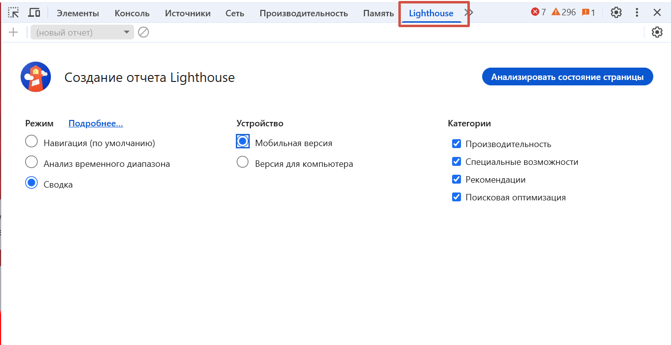Lighthouse — это встроенный инструмент от Google для комплексной проверки веб-страниц. Он генерирует детальные отчеты по пяти категориям: