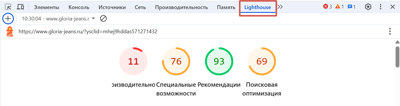 При открытии вкладки вы сразу увидите панель с основными метриками скорости, которые входят в Core Web Vitals от Google. Эти показатели влияют на пользовательский опыт и продвижение в поиске. Здесь отображаются:
