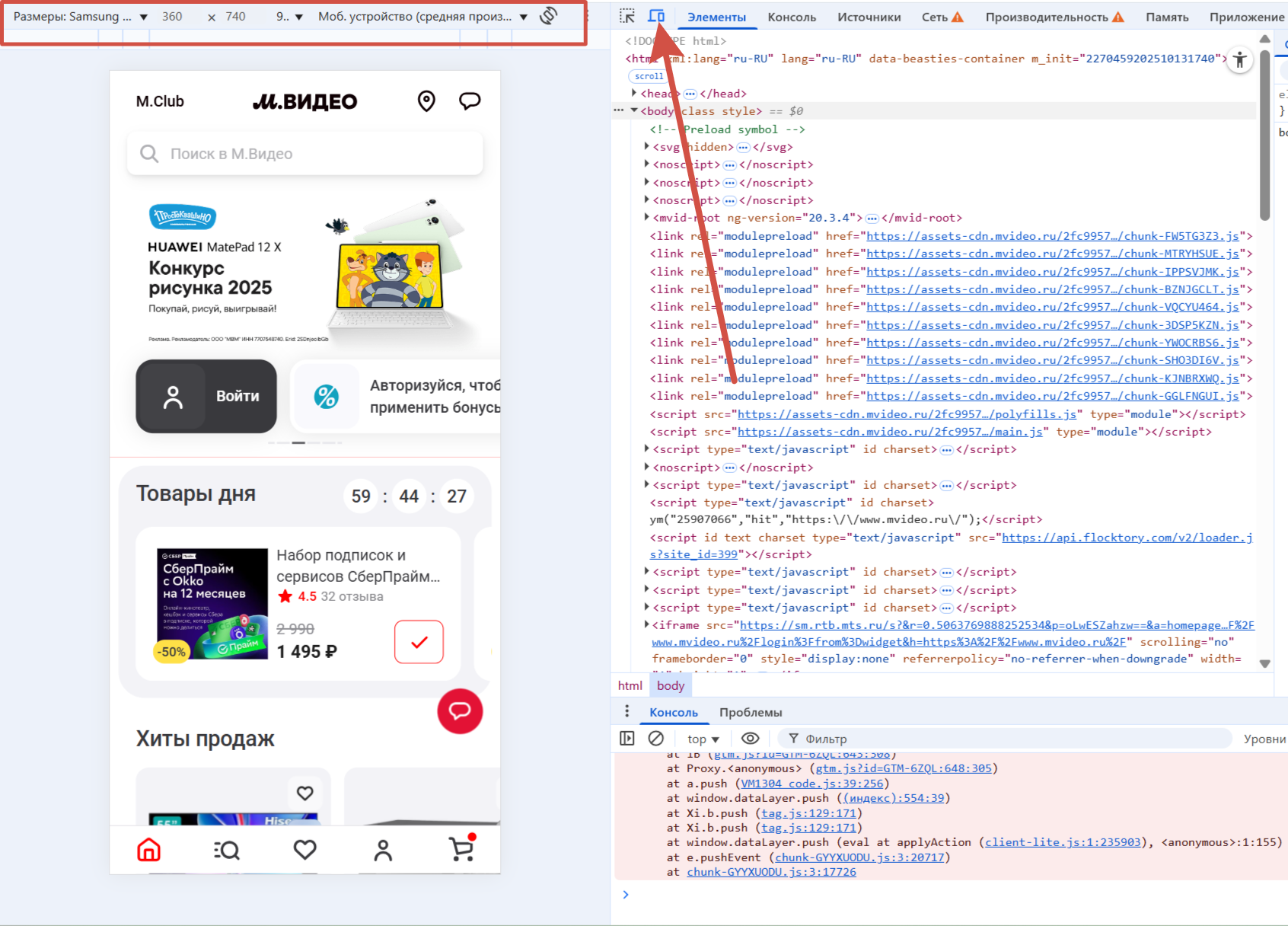 В самом начале меню консоли есть иконка эмуляции мобильных устройств. Эта опция позволяет протестировать, как ресурс будет выглядеть и работать на различных экранах. Открыть инструмент можно также с помощью быстрых клавиш: Ctrl+Shift+M (Windows) или Cmd+Shift+M (Mac).