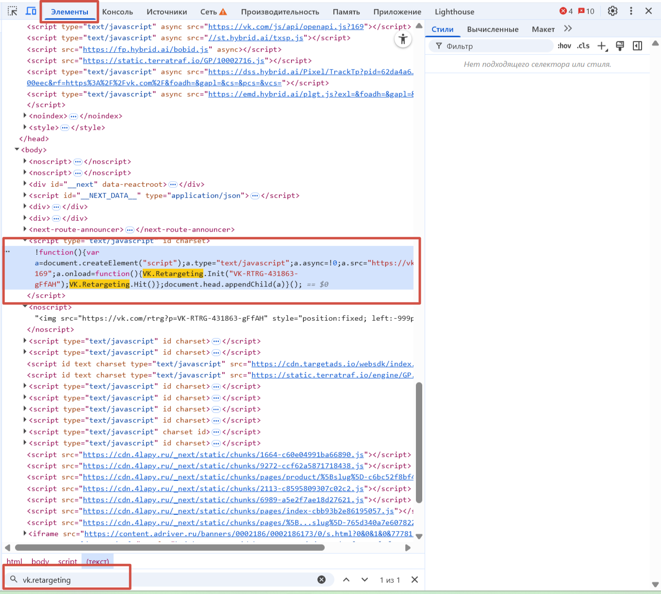 - Открываем строку поиска (Ctrl+F) и фильтруем результат по слову: vk-retargeting.