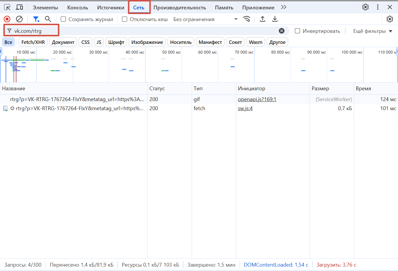 Исправляем и снова открываем консоль, вкладку «Сеть». Вводим vk.com/rtrg и видим, что запросы появились и они успешно выполняются (статус 200) — события поступают.