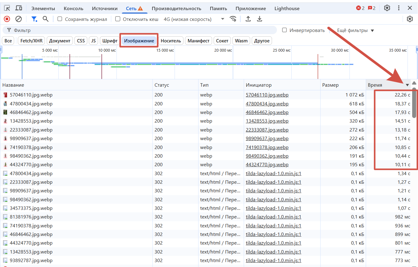 - Смотрим время загрузки каждого изображения.