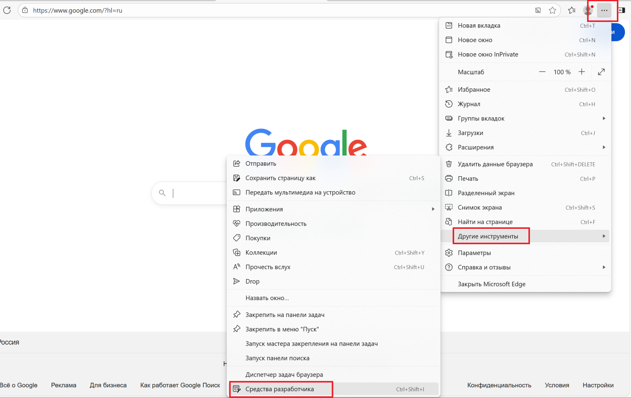 Открываем настройки (три точки вверху экрана) → «Другие инструменты» → «Средства разработчика».