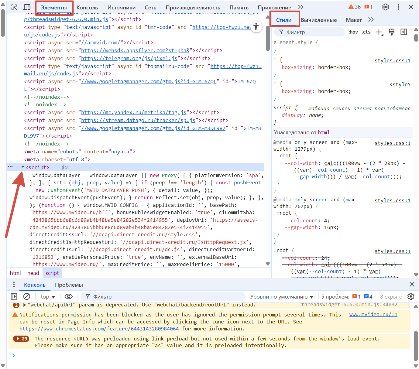 Любой элемент можно детально исследовать, нажав на треугольник рядом. В правой части панели отображаются CSS-стили для выбранного элемента.