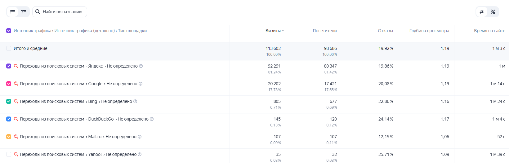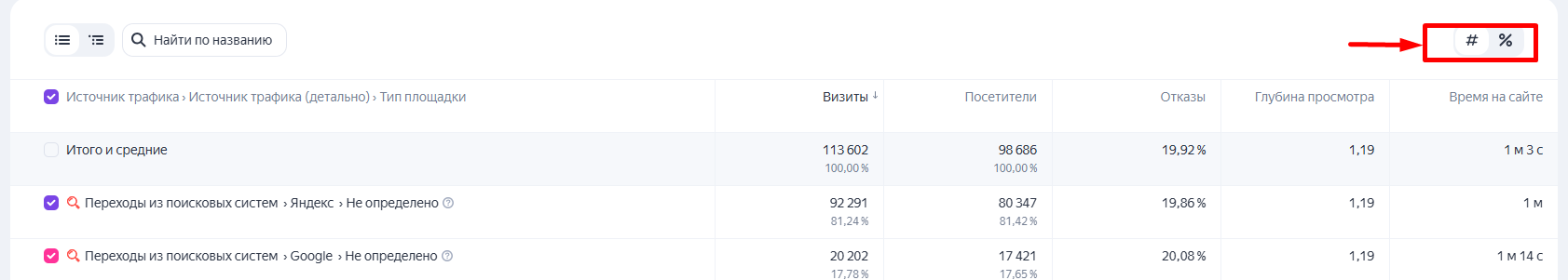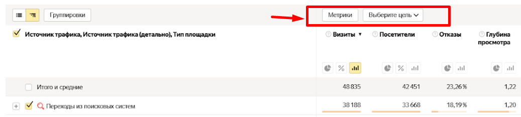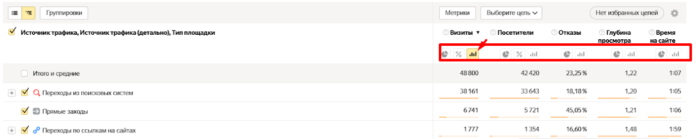 Все элементы отчета находятся в одном месте, что делает интерфейс более простым и систематизированным. Например, можно сразу в группировке настроить отображение строк в таблице по источникам трафика, типу площадки, поведению пользователей и т. д.