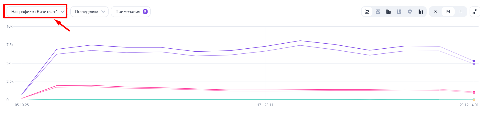 3. Возможность отобразить на графике несколько метрик сразу. Это важнейшее обновление графиков в отчетах, которое позволяет проводить анализ одновременно по нескольким показателям.