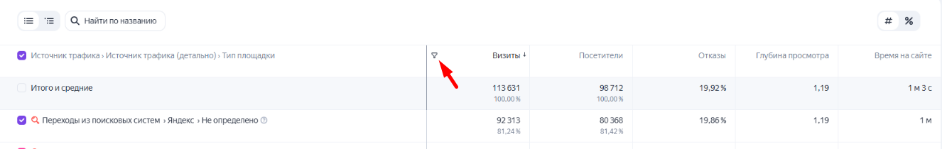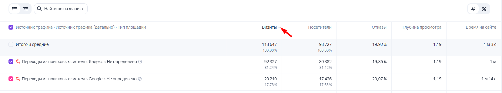 4. Сортировка по возрастанию и убыванию. Настройка осуществляется аналогичным образом, что и при настройке фильтра: при клике по названию колонки появляются стрелки вниз или вверх. С их помощью можно сортировать данные по возрастанию или убыванию. Это позволяет быстро определить самые значимые источники трафика, эффективные рекламные каналы, наиболее интересный контент для целевой аудитории и т. д.