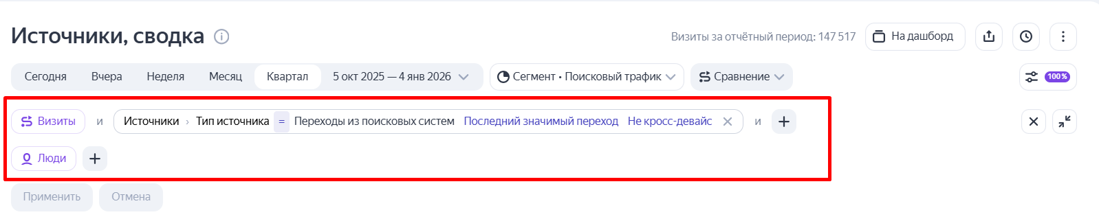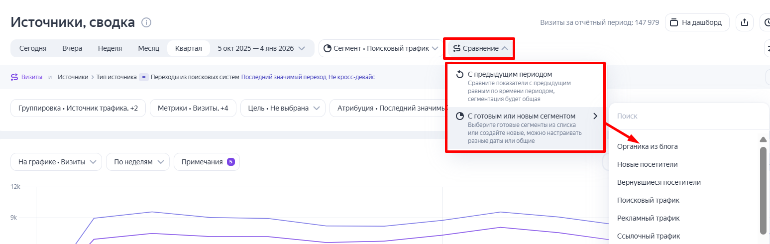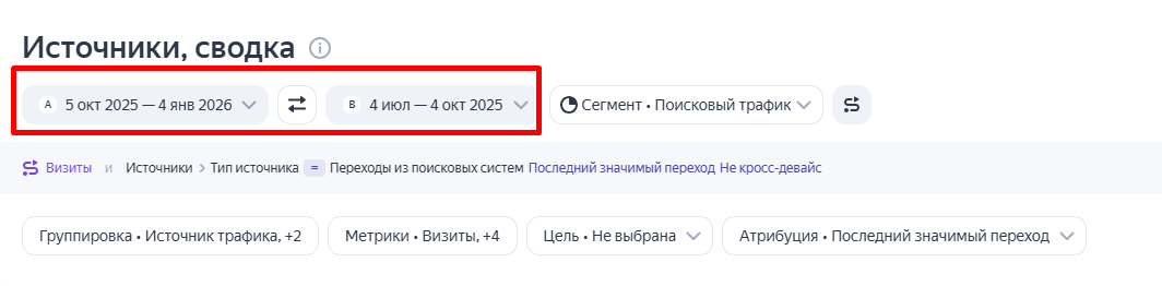 Например, стоит задача сравнить, как изменился поисковый трафик за четвертый квартал по сравнению с третьим. В настройках задаются соответствующие условия: