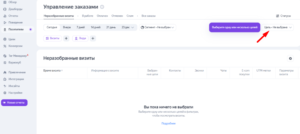 После выбора цели во вкладке «Неразобранные визиты» показываются все визиты за 21 день, в ходе которых совершались эти действия.
