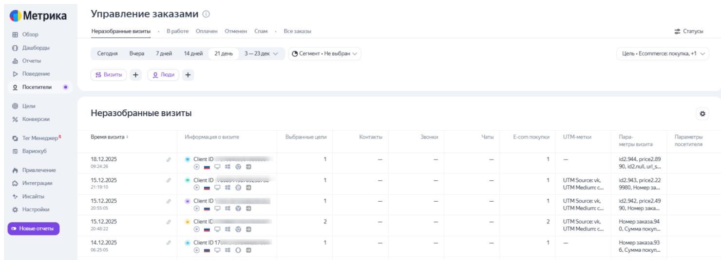 - Связывает данные. Инструмент привязывает информацию о заказе (доход, статус, количество) к конкретному визиту.