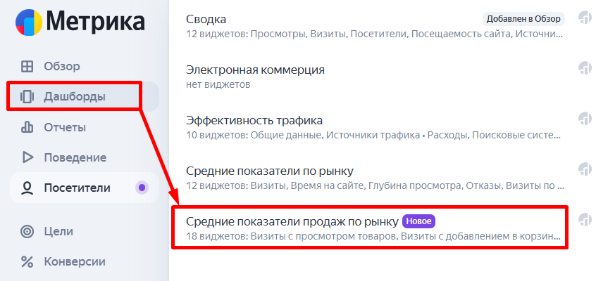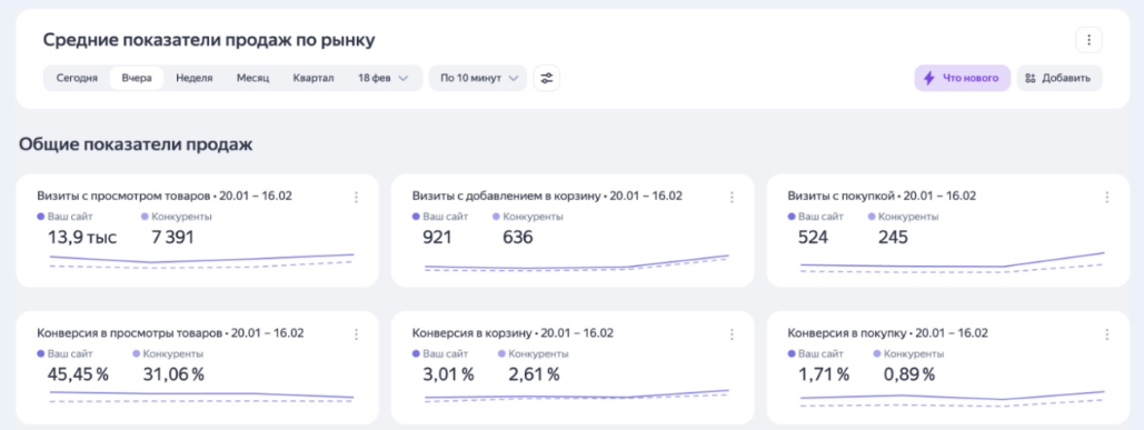 В июне 2025 года в Метрике появился дашборд, который позволяет пользователям сравнивать свои коммерческие показатели со средними показателями ближайших конкурентов и оценивать рынок.