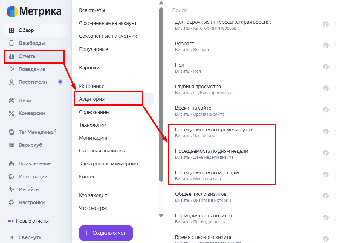 - Для просмотра данных по посещаемости в разрезе времени нужно перейти в «Отчеты» → «Аудитории» → «Посещаемость по времени суток / дням недели / месяцам».