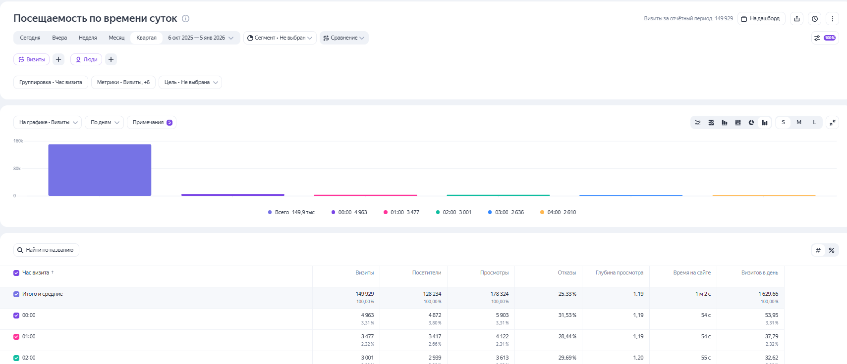 Из отчета можно проследить, как меняется число визитов, посещений, просмотров, отказов и других метрик в зависимости от времени суток.