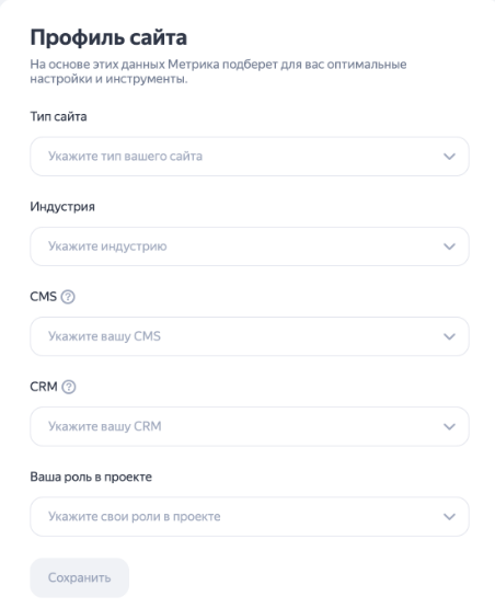 В этом разделе нужно внести информацию о типе сайта, индустрии, используемых CMS и CRM, роли в проекте.