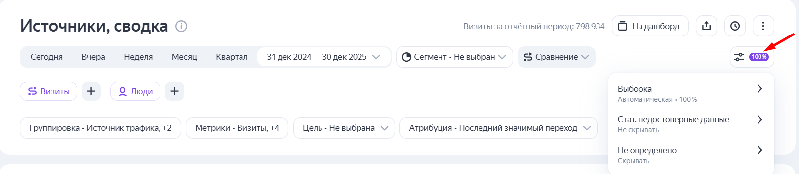 Для более полного анализа все показатели доступны в срезах по источникам и по типам устройств.
