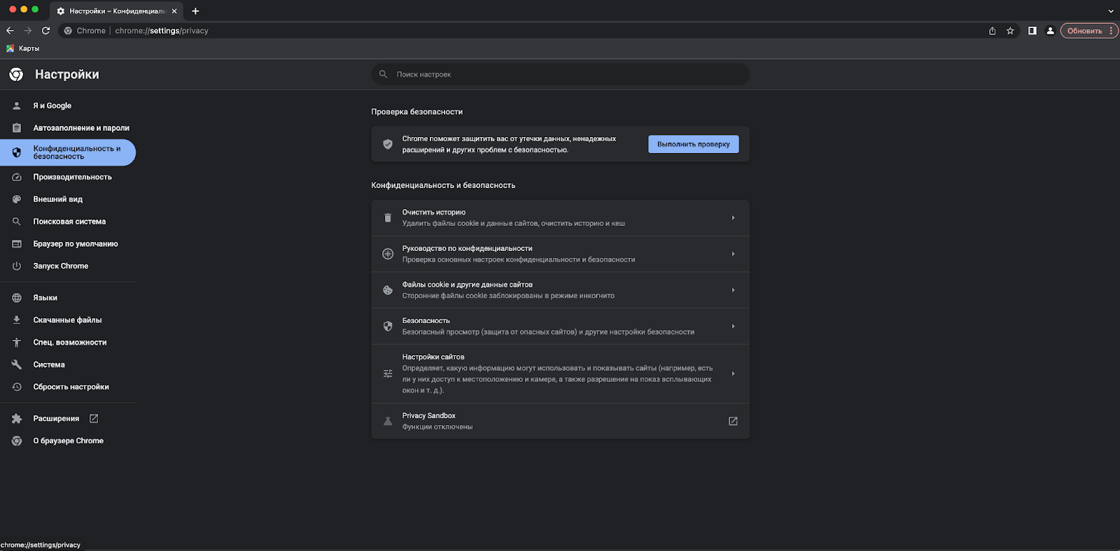 - Google Chrome: Настройки — Конфиденциальность и безопасность.